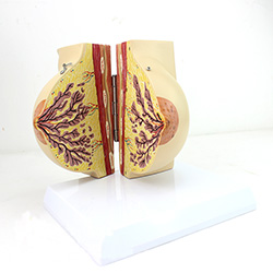 結構特點:該模型由兩個部件組成,可活動打開,顯示靜止期女性乳房剖面結構,共有12個部位指示標志。