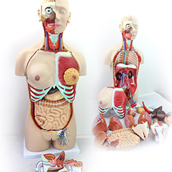 本軀干顯示了,完整的呼吸系統(tǒng),消化系統(tǒng),泌尿(男、女)生殖系統(tǒng),打開的右半頭顱,以及整個背部,顯示完整的中樞神經(jīng)系統(tǒng),整個肺可以取出,顯示完整的橫膈