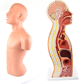 這款教學模型展示了通過鼻、口、咽、氣管、食管和胃的縱切面。塑料食管和其他插管可通過鼻或口插入食管或胃。另加的氣管造口以演示導管呼吸。