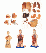 ■ 該模型由胸壁、胸腹腔內臟器官以及男、女性生殖器官等20個部件組成,并顯示人體半身頭頸部軀干的顱腦,胸腹腔內臟器官以及男、女兩性互換的生殖器官等結構,共有200個部位指示示標志。
