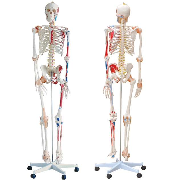 金屬支架,正常直立姿勢(shì),四肢可活動(dòng)。顯示人體運(yùn)動(dòng)系統(tǒng)骨性支架,半邊肌肉(著色)附韌帶。